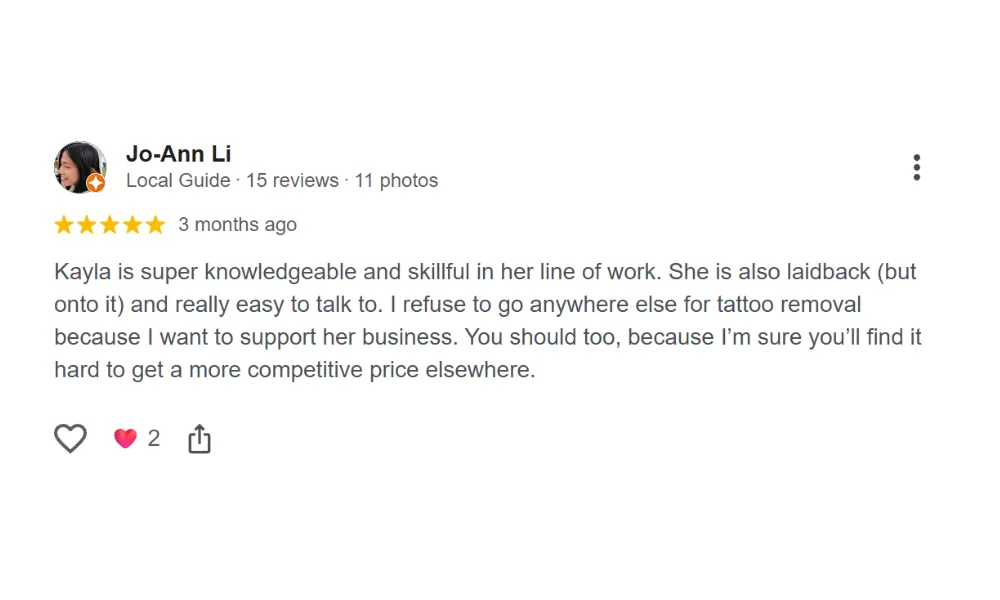 Sessions typically last between 15–45 minutes, depending on the size and complexity of your tattoo.