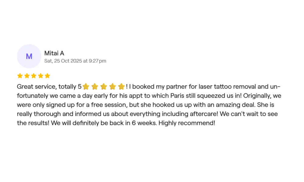 The number of sessions depends on the tattoo’s size, colour, depth, and age. Most tattoos require between 6–12 sessions for full removal. During your free session, we’ll provide a customised treatment plan.
